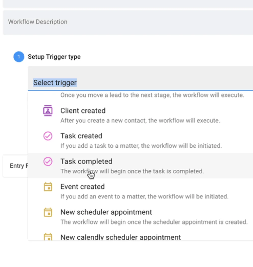 - Matter Moved to Stage or Lead Moved to Stage: this triggers are based on the event of a lead or matter moving from one stage to the next. Perhaps that upon moving them to a new stage, you trigger a new set of tasks to be created or an email follow up sequence.
